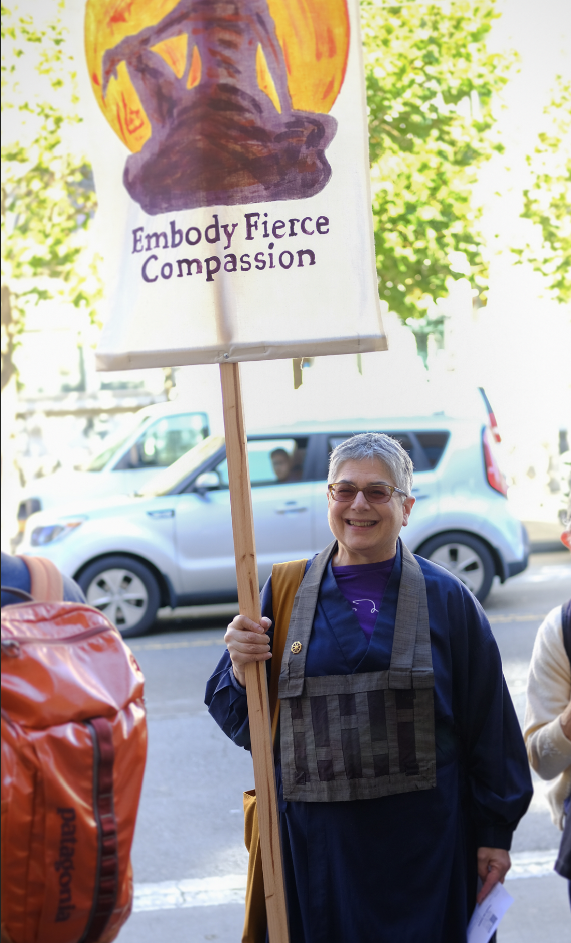 Shōsan Victoria Austin’s original work training was in architecture and urban planning, with a minor in East Asian Studies. She has held many work roles in San Francisco Zen Center, including in SFZC’s early businesses, the Accounting Office, Work Leader, Corporate Secretary, Tenzo, Director, Abbots’ Assistant, Tanto, President, and Outreach Director. Since the 2000s she has been exploring how to write practice-based job descriptions to explore community, intimacy and interconnection in people’s roles in the outer world, as well as in the cloistered world of temple life.